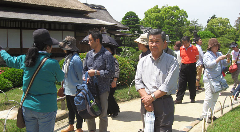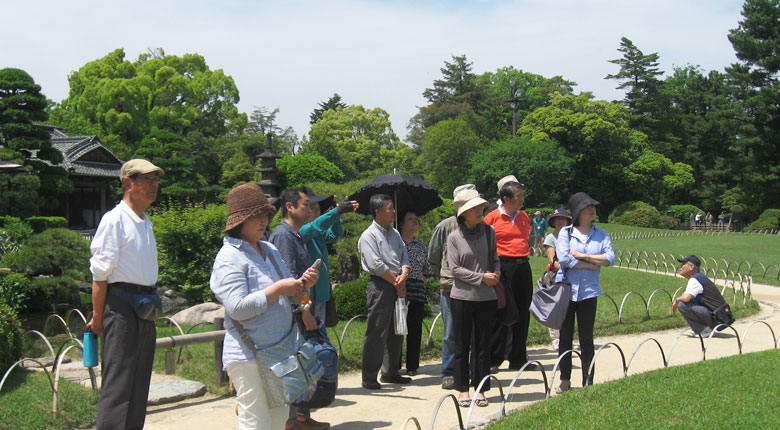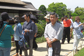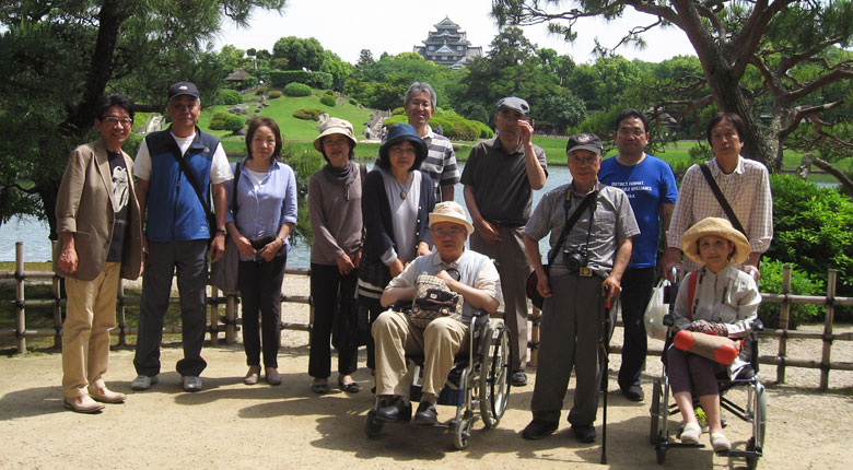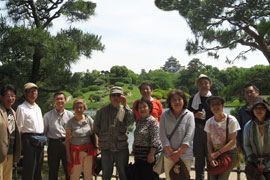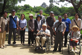 「岡山失語症友の会コスモス」は2015年5月17日、レクリエーション活動として後楽園の散策を楽しみました。五月晴れの陽光の下、柔らかな芝生の絨毯の中で爽やかな空気を感じて、半日を過ごしました。 参加者は、お昼に弁当を食べた後、二組に分かれてボランティアガイドの説明を聞きながら、園内を一周しました。 この日は、後楽園の「茶つみ祭り」の行事もあり、姉さんかぶりに紺絣の着物を着た茶つみ娘が新芽を摘み取る実演や、茶つみ踊りなどを鑑賞しました。